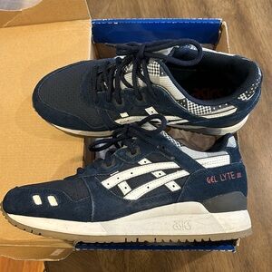 Navy and white ASICS Gel Lyte III. Some fading on the suede.