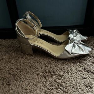 Women’s ASOS Kitten Heels With Bows Size 8 Pointed Toe Silver Shoes. Like new.
