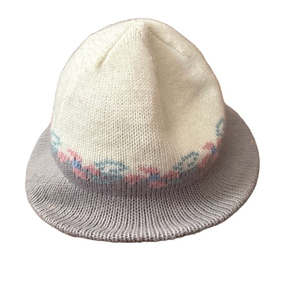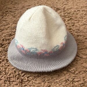 Soft knit hat featuring a cream base with pastel pink and blue accents. Perfect for chilly days.