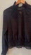 Armani Exchange black semi-sheer blouse. Features a mock neck, long sleeves with elasticized cuffs, and an elasticized hem. Chevron pattern with subtle glitter throughout. Made in Size S/P. Measurements are provided. The material appears to be a lightweight woven fabric. No visible stains or tears; condition is wonderful