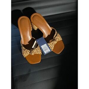 Step into warm-weather style with the Women's Aaliyah Raffia Strappy Knot Sandal Heels in size 7 from Universal Thread. These chic slip-on heels feature a raffia and polyester upper with stylish knot detailing, designed with an open square toe and backless construction for a breezy, modern look. The block heel measures approximately 2.25 inches, offering both comfort and a subtle lift, while the cushioned polyurethane insole ensures all-day wearability. Built with a non-marking, textured TPR outsole for reliable traction, these heels are versatile enough for pairing with dresses, skirts, or denim. Easy to maintain with mild detergent cleaning, these medium-width sandals bring together durability, comfort, and effortless style. Retails for $40. This item is brand new.