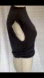 Black fabric with stretch, sleeveless, ruching on sides, mock neck collar. Great condition.