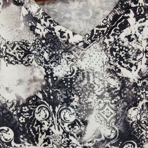 Black and white abstract Paisley Print has a small stain. No brand or fabric info. Bust 21 // Length 25