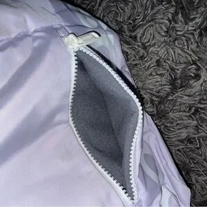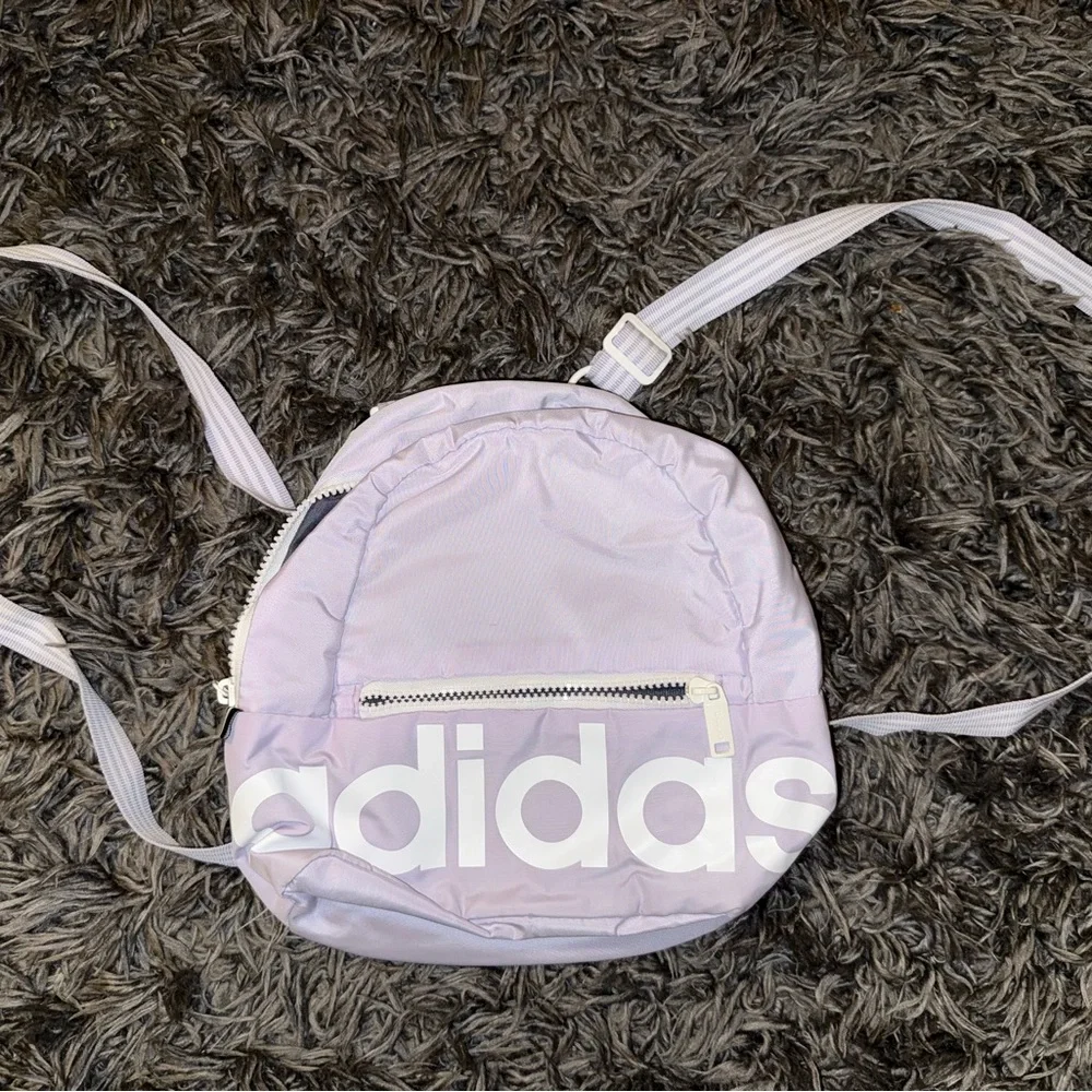 Compact lilac backpack by adidas. White adidas logo on internal pocket. Zippered mesh compartment inside. Padded straps for comfort.