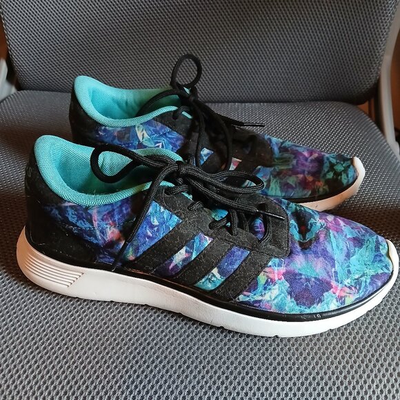 These are gently used Adidas Womens size 8 sneakers. Super light and comfy. They have a pretty purple and blue cracked ice pattern.
