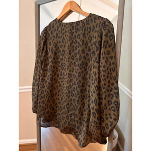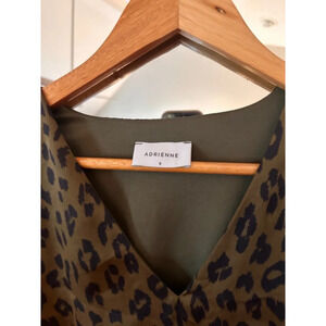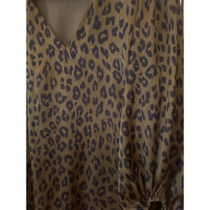 This is a pre-owned Adrienne long-sleeved blouse in size S. It features a V-neckline, a relaxed fit, and a leopard print pattern in shades of brown and black. The blouse is made of a soft, silky fabric and has a gathered detail at the cuffs. The blouse is in good condition with no visible signs of wear or damage. The fabric is smooth and free of any pilling or snags. The seams are all intact and the stitching is secure. The blouse has a slight sheen to it, which adds to its luxurious feel. The blouse is a versatile piece that can be dressed up or down. It would be perfect for a night out or a casual day look.