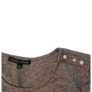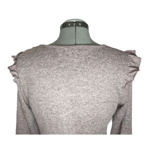 Women's Adrienne Vittadini Mauve Ruffle Soft Sweater, Size Large. Very soft and stretchy material. Mauve in color, purple pink. Has a ruffle on each shoulder and the left should has three detail buttons. Small metal logo on the bottom front left. 3/4 sleeves. Excellent condition, no flaws or wear.