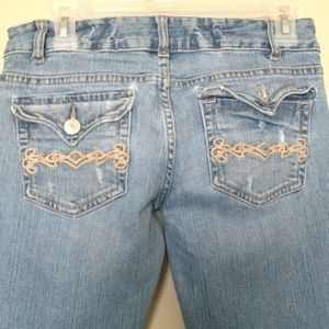 Love the fit of these jeans, but I can no longer fit in them. Size 3/4 long. Skinny flare. One pocket is missing button.