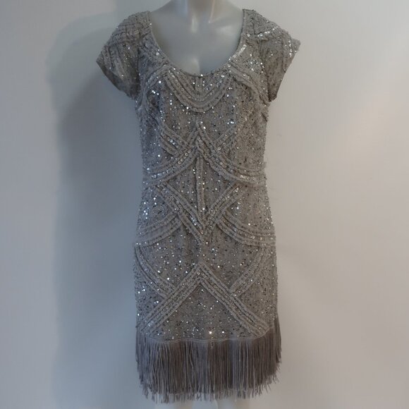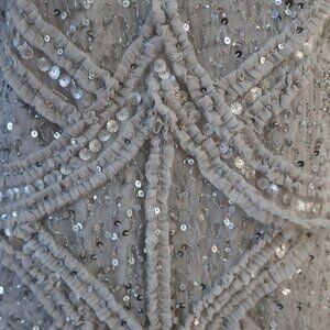 Womens Aidan Mattox Gray Silver Sequin Cap Sleeve Midi Sheath Pencil Dress 14