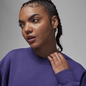 The Womens Air Jordan Flight Fleece Crewneck Sweatshirt in Purple is a stylish and comfortable activewear piece perfect for the winter, fall, and spring seasons. This oversized sweatshirt features a crew neck, long sleeves with raglan sleeves, and a solid pattern with the iconic Air Jordan logo accent. Made from a blend of polyester and cotton, this relaxed-fit sweatshirt is machine washable and has a chest size of 54 inches, making it a versatile and fashionable addition to any woman's wardrobe, representing the Nike Jordan brand and Michael Jordan theme.