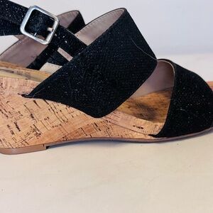 Step out in style with these chic black cork wedge sandals. Perfect for any occasion, these shoes offer both comfort and elegance.