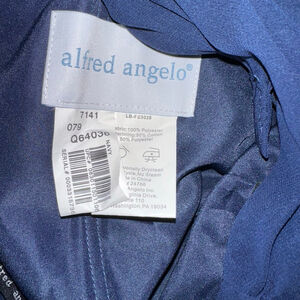 This is a pre-owned Alfred Angelo navy blue dress, size US 18. The dress is made of 100% polyester fabric with 50% cotton and 50% polyester interlining. It features a square neckline, wide straps, and a ruched bodice. The dress has a floor-length, flowing skirt. There are no visible stains or tears. The dress is in good condition.