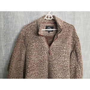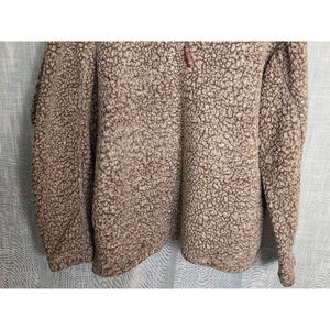 This is a pre-owned Alpine Sherpa pullover in size XXL. The exterior is made of a brown sherpa material. It features a quarter-zip closure with a red and blue zipper pull. The interior lining is a smooth brown fabric. There are no visible stains, tears, or other significant imperfections. The garment appears to be in good condition.