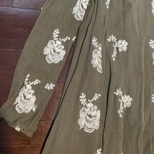 Great condition - Women's Altar’d State Floral Long Sleeve V-Neck Dress. Has pockets and cut out design on upper back. Has a lining layer. Colors: olive green and white. Size: L.