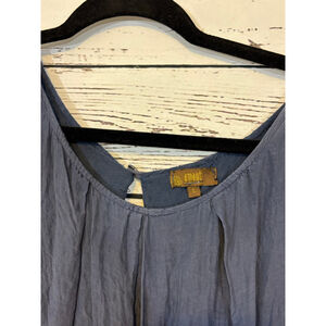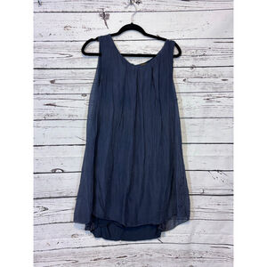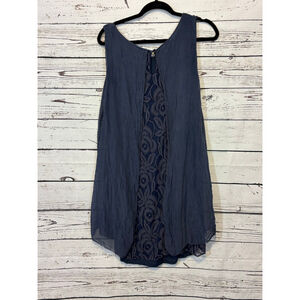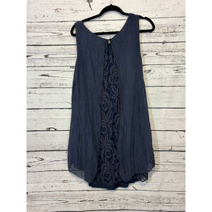 This is a pre-owned Amanti sleeveless tunic in a dark blue color, size S. The garment features a V-neckline with subtle pleating at the front and a keyhole closure with a button at the back. The back of the tunic has a central panel of dark blue lace with a floral pattern. The material appears to be a lightweight, crinkled fabric, possibly a blend, with a sheer overlay at the hem. No visible signs of wear or damage are apparent in the provided images.
