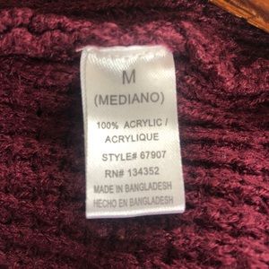 Burgundy waffle knit sweater, pre owned but in good shape! Minor pilling. Falls below the waist. Typically worn with an undershirt