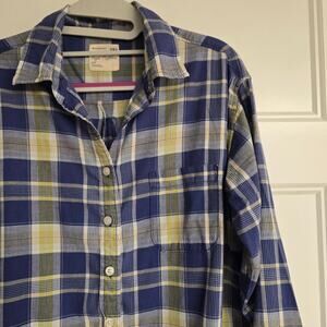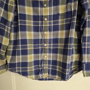 Excellent condition, women's American Eagle "Boyfriend Fit" button down top in a blue and yellow plaid. This is a lightweight material, not flannel. This top has a rounded bottom. The material doesn't stretch.
