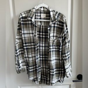 Distressed and oversized boyfriend flannel in black, olive green and cream