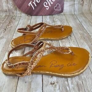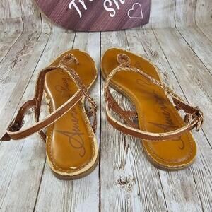 These American Eagle sandals are perfect for summer. They are a size 7 and are in fair condition. The sandals are made of a brown material and have a braided design. They also have a buckle closure for a secure fit.