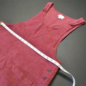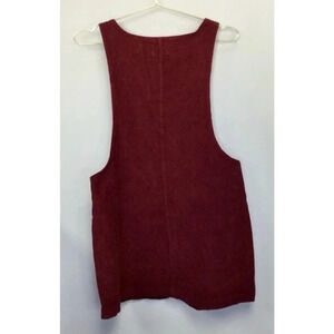 This is a pre-owned American Eagle Outfitters women's corduroy overall dress in a burgundy color. It features a scoop neck, adjustable straps with button closures, two front pockets, and a straight skirt silhouette. The dress is made of 98% cotton and 2% elastane and is machine washable. The dress measures approximately 36 inches in length and 20 inches across the shoulders. The dress is in fantastic used condition with no visible signs of wear or damage.