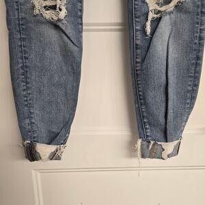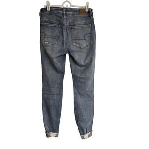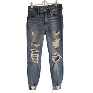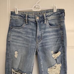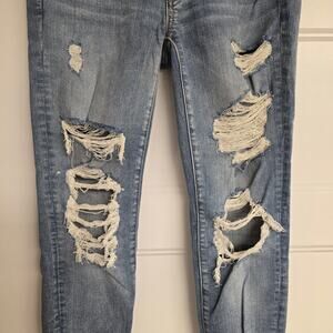 Excellent condition, women's American Eagle "Hi-Rise Jegging" destructed skinny jeans in a lightwash denim. These do stretch.