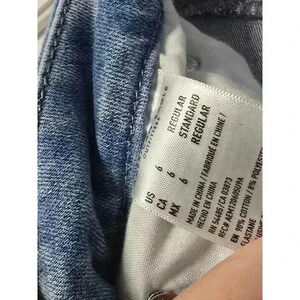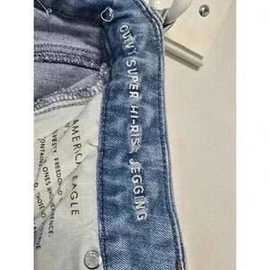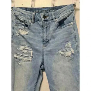 These are a pair of pre-owned American Eagle "Curvy Super Hi-Rise Jegging" jeans in a light blue wash. They are size 6 and are made of 98% cotton and 2% elastane. The jeans have a high rise and a skinny fit. They feature several distressed areas, including rips and tears on the front and back of the legs. There is a small, faint mark on the back right pocket. The jeans are in good condition, with no major flaws or damage. They have been worn and washed, but are still in good shape. The jeans are a great option for casual wear and can be dressed up or down.