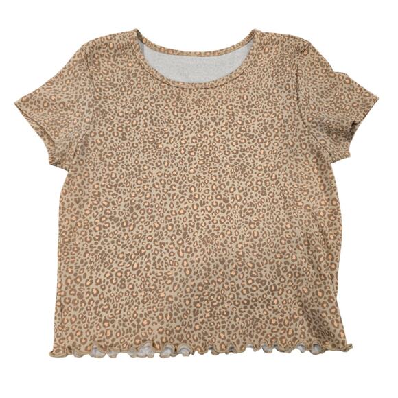Excellent condition, women's American Eagle leopard print, cropped, short sleeve tee. This has a ruffle seam at the bottom. This material stretches.