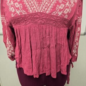Excellent condition, women's American Eagle pink, v-neck, boho, swiss dot blouse with 3/4 length sleeves. This top has an oversized/loose fit. This material is lightweight and doesn't stretch. The sleeves tie at the ends.