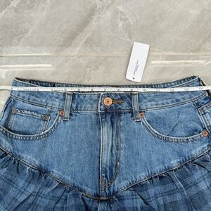 Brand new with tags - Women’s American Eagle Plaid Tiered Ruffle Denim Skirt. Has three front pockets and zipper with button closure. Color: denim blue. Size: 6.