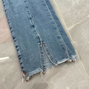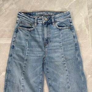 Good condition - Women’s American Eagle Slim Straight Super Stretch Frayed Hem Jeans. Has three front pockets, two back pockets, and zipper with button closure. Has frayed hem design with v cutout on the end of the pant leg. Color: light wash denim. Size: 00 regular.