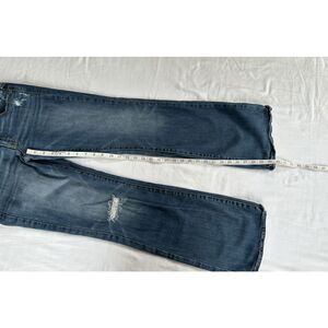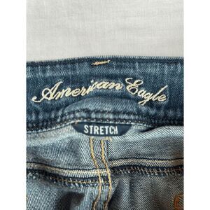 This is a nice pair of American Eagle jeans that are in good condition. This zipper works fine and there are no holes in the pockets. They are stretchy. The cuffs have very minor wear to them, although I think they were made that way. Measurements are in the pictures.
