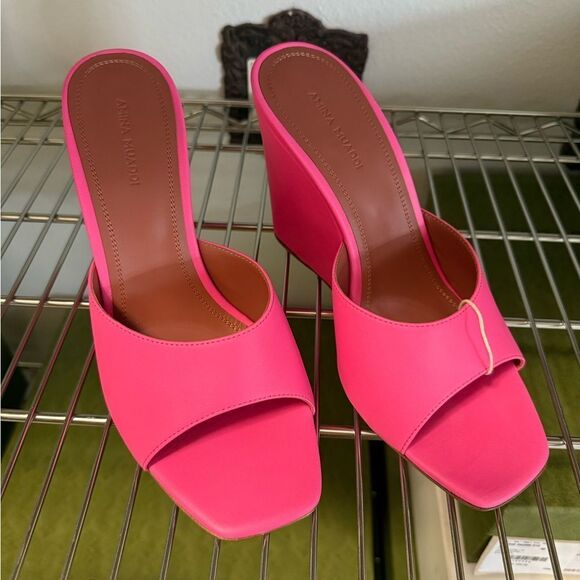 Brand new with box and dustbag Amina Muaddi Lupita leather wedge mules Step out in style with these vibrant pink wedge sandals from . Perfect for adding a pop of color to any outfit.