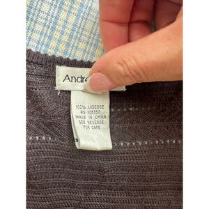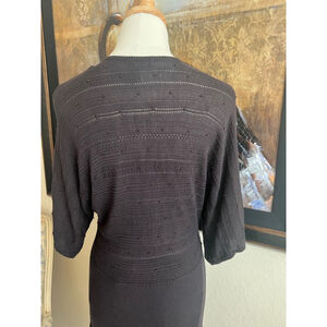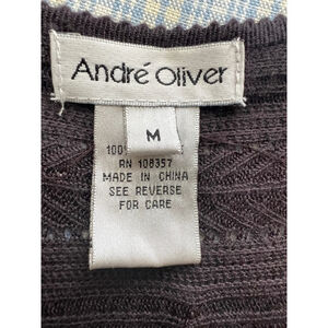This is a pre-owned Andre Oliver women's cardigan sweater in size M. It is made of 100% viscose and features a deep V-neckline, a button-up front closure, and 3/4 sleeves. The sweater is adorned with small, dark brown beads throughout the fabric, creating a subtle and elegant design. The sweater is in good condition with no visible signs of wear or damage. The fabric is soft and comfortable, and the sweater is well-made. The sweater is a dark brown color and has a slightly textured knit. The sweater is approximately 26 inches long and 17 inches wide. The dolman sleeves are approximately 16 inches long. The sweater is a versatile piece that can be dressed up or down.