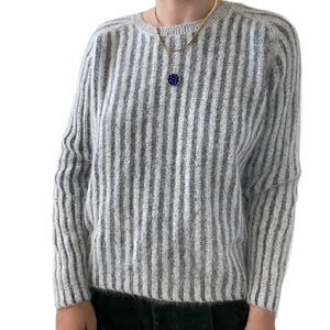 Womens Angora Blend Gray White Stripe Fluffy Fuzzy Soft Crewneck Preppy Sweater
