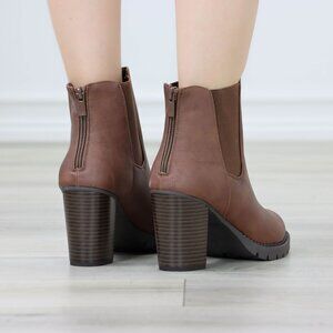 Womens Ankle Boots Lug Block Heel Brown Synthetic Leather Round Toe Elastic Gore
