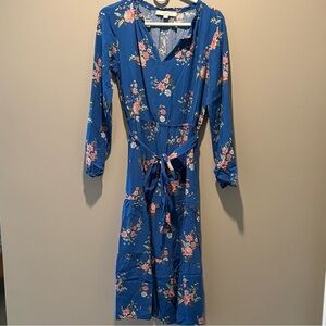 This charming dress from LOFT features a vibrant blue base adorned with a delicate pink floral pattern. The smocked tie waist detailing adds a touch of elegance, making it a versatile piece for any occasion. **New without tags**