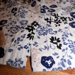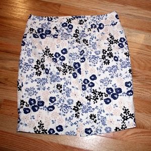 Lovely floral patterned pencil skirt by Ann Taylor. Size 8P. Slit in the back. Zip closure. Cream, navy, and periwinkle.