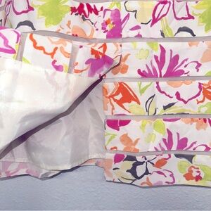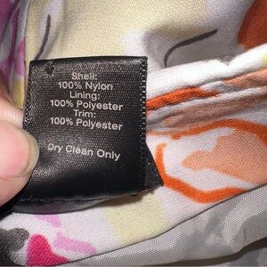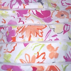 White with pink, green and orange multicolor floral designs. Sheer horizontal stripes. Lined. Zip up back.