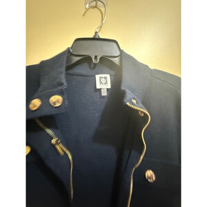 This is a pre-owned Anne Klein navy blue jacket seater . It features a full gold zipper closure and four functional flap pockets with gold button details. The jacket is made of a soft, knit material.