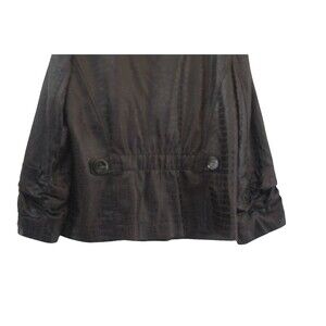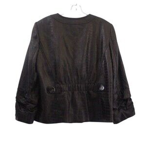 Women's Anthracite byMuse Faux Croc Jacket in size 14. Made from a blend of 75% polyester and 25% rayon. Crock pattern in black and brown. Short length, collarless design, padded shoulders and hook & eye closure. No rips, tears, holes or stains.