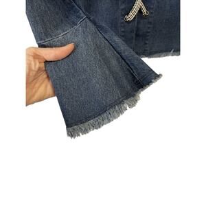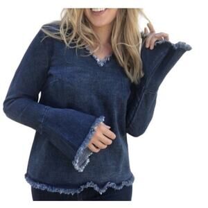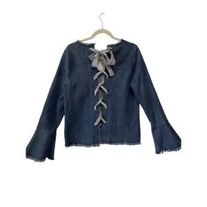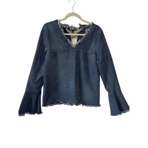 Add a touch of fall to your wardrobe with this Anthropologie Moelleux Raw Hem Denim Jean Back Gingham Lace Up Top. The V-neckline and bell sleeves give it a feminine touch, while the cotton blend material and denim fabric type make it comfortable to wear. The blue color and black and white gingham pattern on the tie that laces up the back add a unique touch to this top, making it perfect for any occasion. It's available in size M and is ideal for women who want to showcase their style.