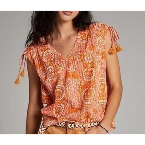 Super cute, soft and flattering! Womens Anthropologie Shirred Cap sleeve blouse, tasseled, orange & pink patterned, cotton blend, size S EUC!