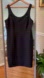 This Antonio Melanie Beaded black sleeveless dress features a beaded neckline. The dress is knee-length, made from a smooth, possibly synthetic fabric, and has a simple, fitted silhouette. The back has a zipper closure. The beads appear to be dark-colored and consistently spaced. Measurements are provided. No visible stains or tears are apparent in the provided images. . The overall condition appears to be in excellent condition
