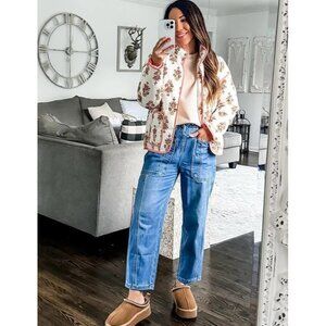 Women’s Apricot Cropped Puffer Quilted Jacket Floral Print Lightweight Coat