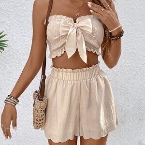 Women's Apricot Solid Color Front Shirred Knot Strapless Crop Top And Shorts Set