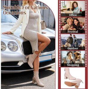 Elevate your style effortlessly with our chic women's ankle boots featuring a 2.36'' low chunky heel, comfortable suede upper, soft latex insole, warm fleece lining and eye-catching two-color patchwork.