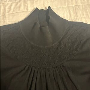 Black. Crochet design at top. High neck with buttons in the back. Great condition. Perfect for the business casual office.