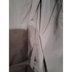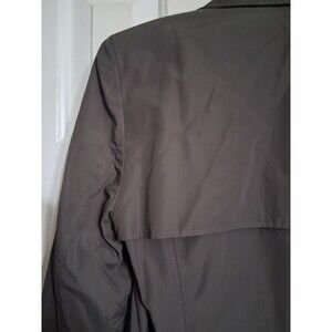 See pics of back belt loop. Threads a little loose, later on may need tacking. Women's Armani Exchange charcoal trenchcoat raincoat? size small. Shell is nylon and cotton. Lining is acetate. Good preowned condition.