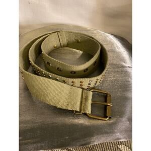 Women's Army / Olive Green Webbing Belt completely covered with steel, Copper and brass mini studs. Also plastic diamonds (only 13). One stud missing at the end. Labeled size 10, but measures 42 inches from end to end. 1.50 in wide. Good used condition.