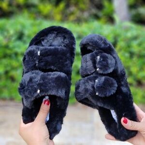 Women's Around Furry Fluffy Flat Slippers Black Color